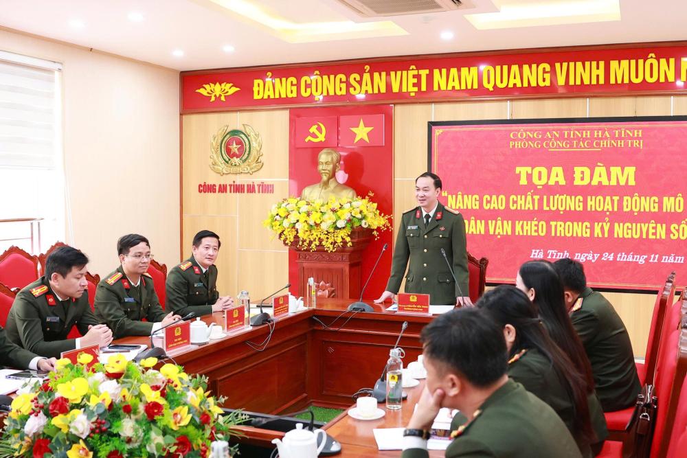 Phát biểu chỉ đạo tại buổi lễ ra mắt, Đồng chí Phó Giám đốc yêu cầu đơn vị tập trung thực hiện một số nhiệm vụ trọng tâm sau: Quán triệt sâu sắc Nghị quyết của Chi bộ về mô hình “Dân vận số”, triển khai bài bản, khoa học và bền vững. Kiện toàn tổ chức, phân công rõ trách nhiệm, nâng cao năng lực đội ngũ admin và cộng tác viên; đầu tư trang thiết bị, công nghệ phục vụ quản trị và sản xuất nội dung số. Tăng cường phối hợp giữa các đội, ban và kết nối với Công an các đơn vị, địa phương nhằm bảo đảm nguồn thông tin nhanh – chính xác – nhân văn – gần dân. Chủ động dự báo, định hướng dư luận, kịp thời đấu tranh với thông tin sai sự thật; lan tỏa mạnh mẽ hình ảnh đẹp, gương người tốt – việc tốt của lực lượng Công an Hà Tĩnh. Thường xuyên đánh giá, cập nhật xu hướng truyền thông mới, lấy hiệu quả tương tác và sự đồng thuận của Nhân dân làm thước đo quan trọng nhất.