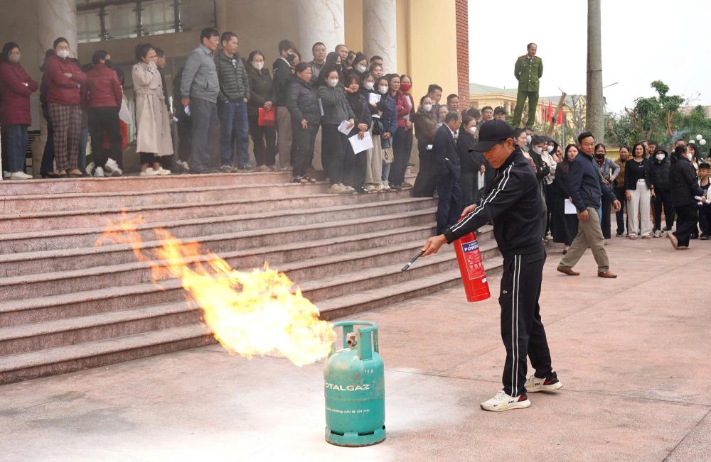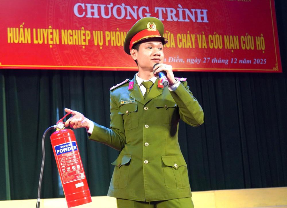 Kết thúc đợt huấn luyện, các học viên được kiểm tra lý thuyết và thực hành kỹ năng sử dụng phương tiện chữa cháy tại chỗ, thiết bị cứu nạn, cứu hộ để dập tắt đám cháy giả định xuất phát từ bình gas trong nhà.