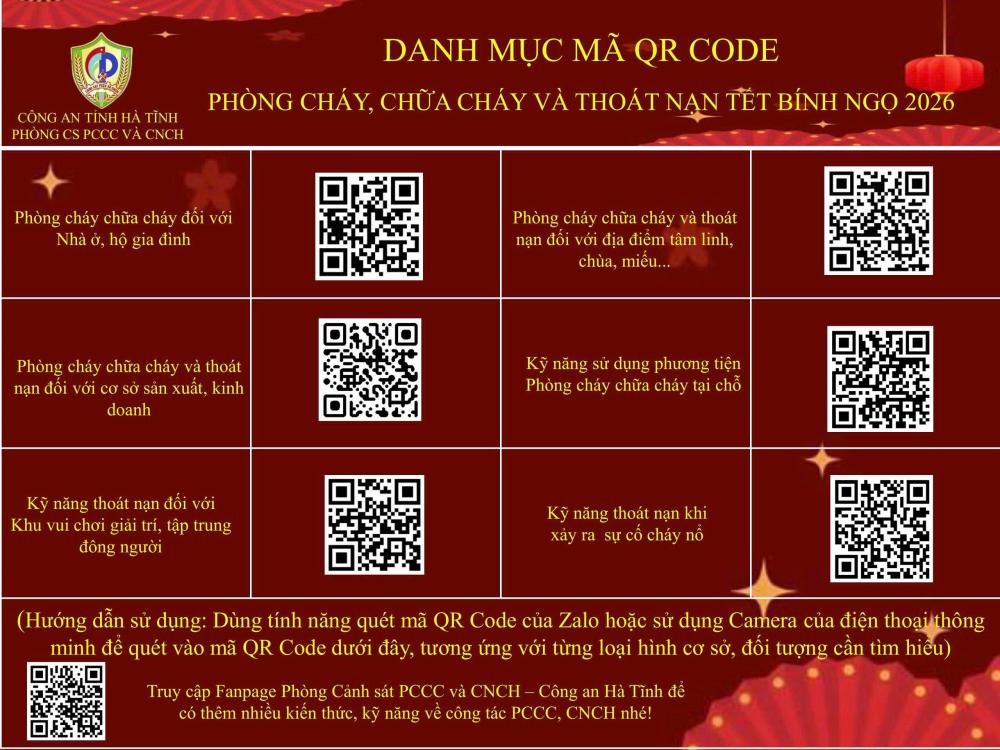 Theo đó, Phòng Cảnh sát PCCC và CNCH Công an tỉnh Hà Tĩnh đã xây dựng hệ thống mã QR Code tích hợp nhiều nội dung tuyên truyền thiết thực, dễ tiếp cận, bao gồm kiến thức cơ bản về phòng cháy, chữa cháy, kỹ năng xử lý tình huống khi xảy ra cháy, nổ, kỹ năng thoát nạn an toàn tại hộ gia đình, cơ sở sản xuất, kinh doanh và nơi làm việc.