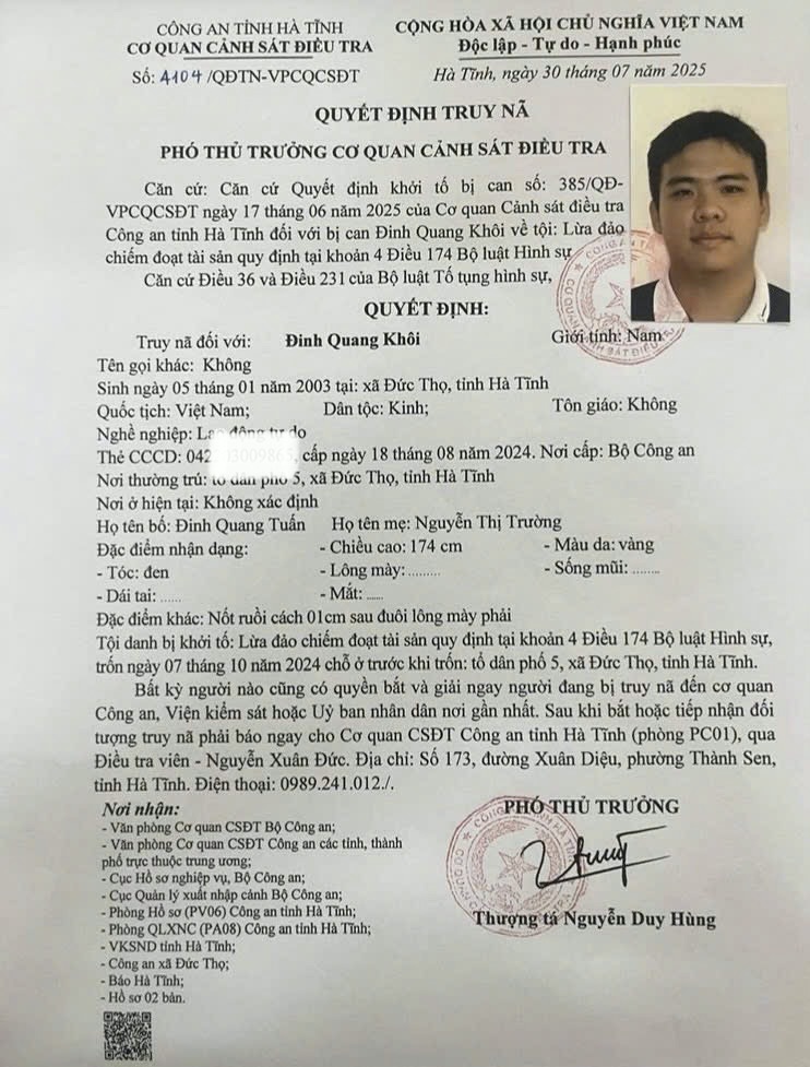 Người dân tổ dân phố 5, thị trấn Đức Thọ (cũ) nay là xã Đức Thọ, tỉnh Hà Tĩnh không lạ gì gia đình cậu thanh niên Đinh Quang Khôi. Sinh năm 2003 trong một gia đình bất hảo, cha đẻ của Khôi là Đinh Quang Tuấn, sinh năm 1971, năm 2021 bị Công an tỉnh Nghệ An bắt, sau đó bị Tòa án nhân dân tỉnh Nghệ An tuyên án chung thân về tội vận chuyển trái phép chất ma túy. Là con út trong gia đình, Khôi còn có chị gái cũng vào tù ra tội về tội đánh bạc. Sinh ra trong một gia đình như vậy, Khôi không tu chí lao động, làm ăn mà nghĩ ra đủ trò để lừa đảo chiếm đoạt tài sản. Đến đầu năm 2025, khi đã lừa được nhiều người dân trên địa bàn với số tiền hơn 2 tỷ đồng, Đinh Quang Khôi trốn ra nước ngoài sinh sống.