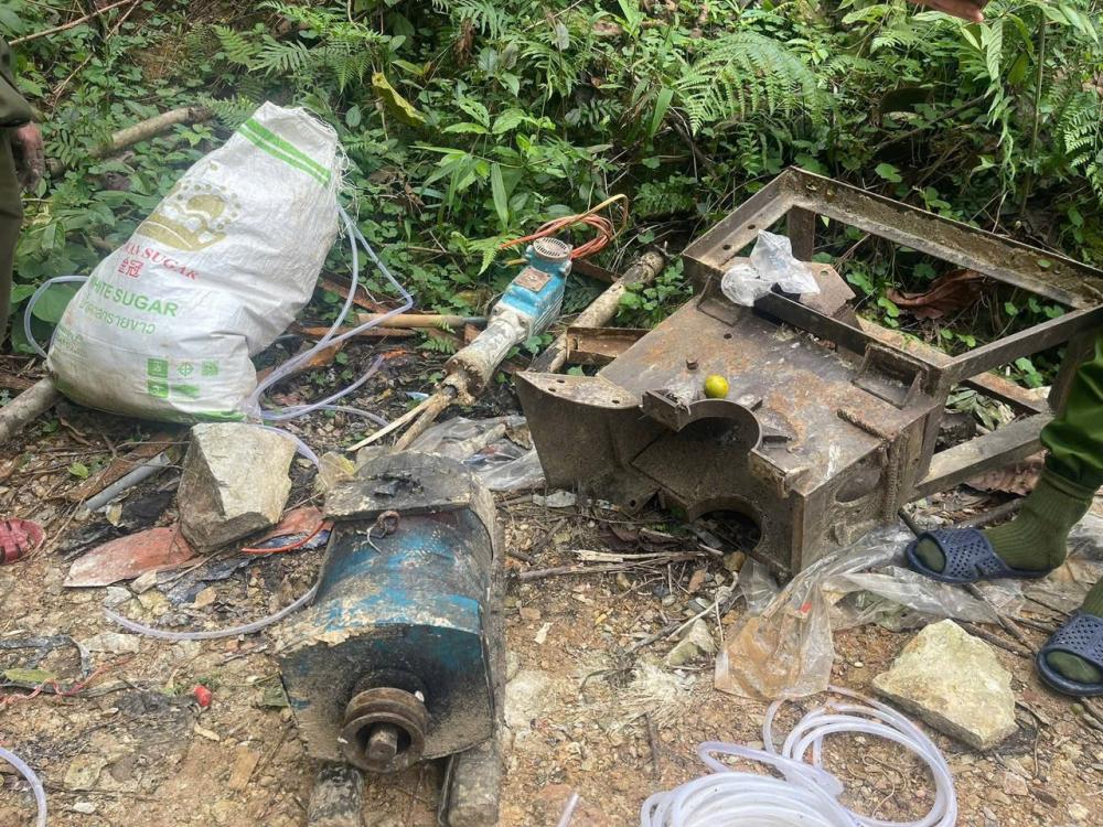 Tại hiện trường, đoàn phát hiện nhiều hố đào, bãi đất đá và dụng cụ phục vụ khai thác vàng. Các dấu vết cho thấy hoạt động đào đãi diễn ra lén lút trong thời gian gần đây.Thời điểm trên không có đối tượng nào xuất hiện trong khu vực này.