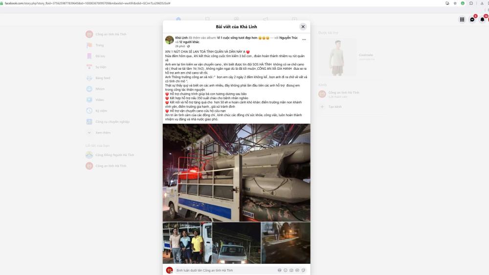 Câu chuyện được tài khoản Facebook Khả Linh chia sẻ lại với lời nhắn đầy tình cảm: “Xin 1 nút chia sẻ lan tỏa tình quân và dân này ạ”. Theo nội dung bài viết, sau khi hoàn thành công tác tìm kiếm ba bố con mất tích tại khu vực sông Lam, trời đã về khuya. Nhóm thiện nguyện đã mệt nhoài sau hai ngày hai đêm vật lộn với nước xiết, nhưng vẫn loay hoay chưa thể về nhà vì không có phương tiện chở cano, trong khi thuê xe tải vận chuyển thì chi phí đắt đỏ. Giữa lúc khó khăn ấy, Công an xã Gia Hanh đã chủ động đưa xe của đơn vị đến hỗ trợ, giúp nhóm vận chuyển cano về trong đêm muộn.