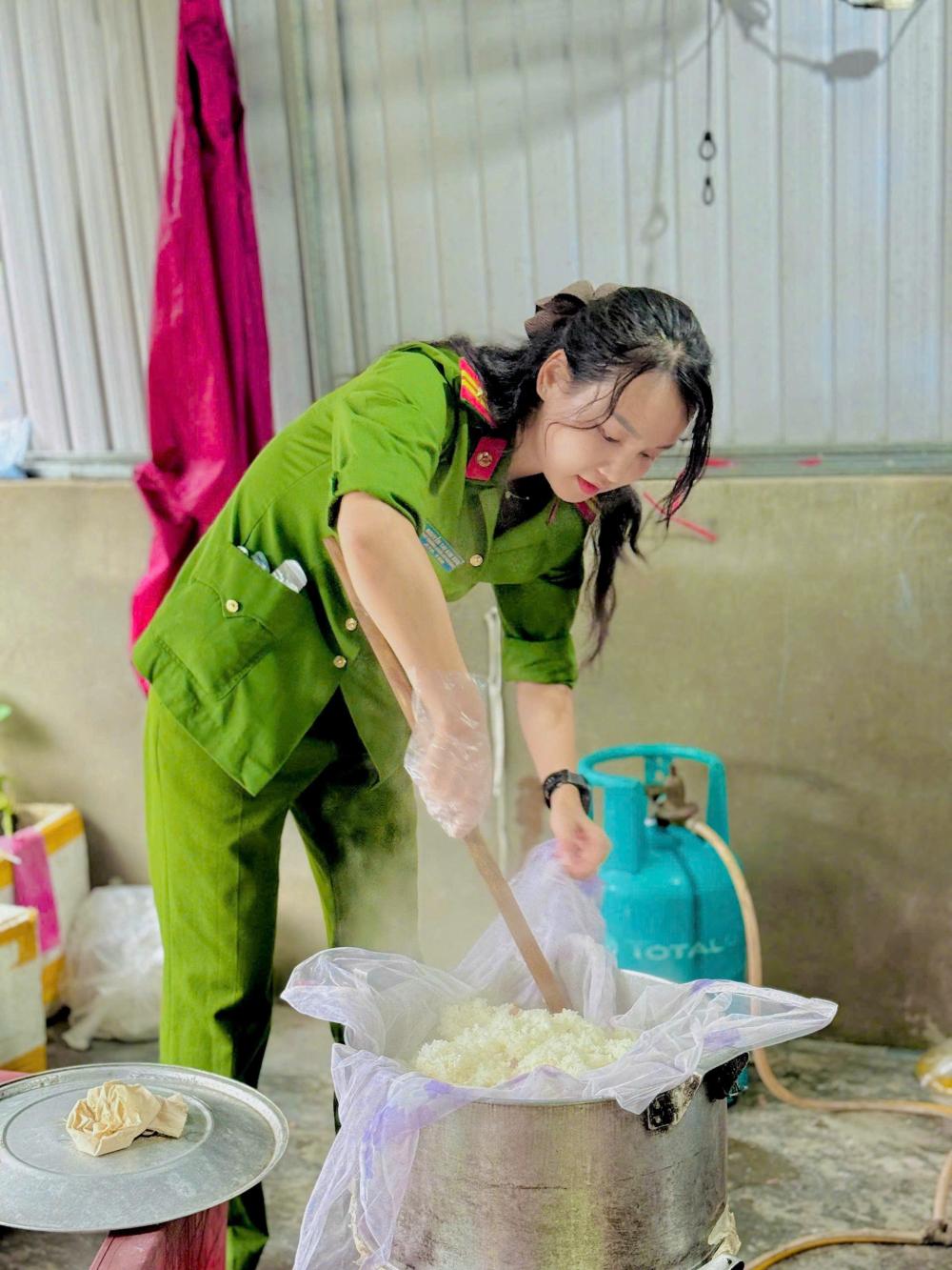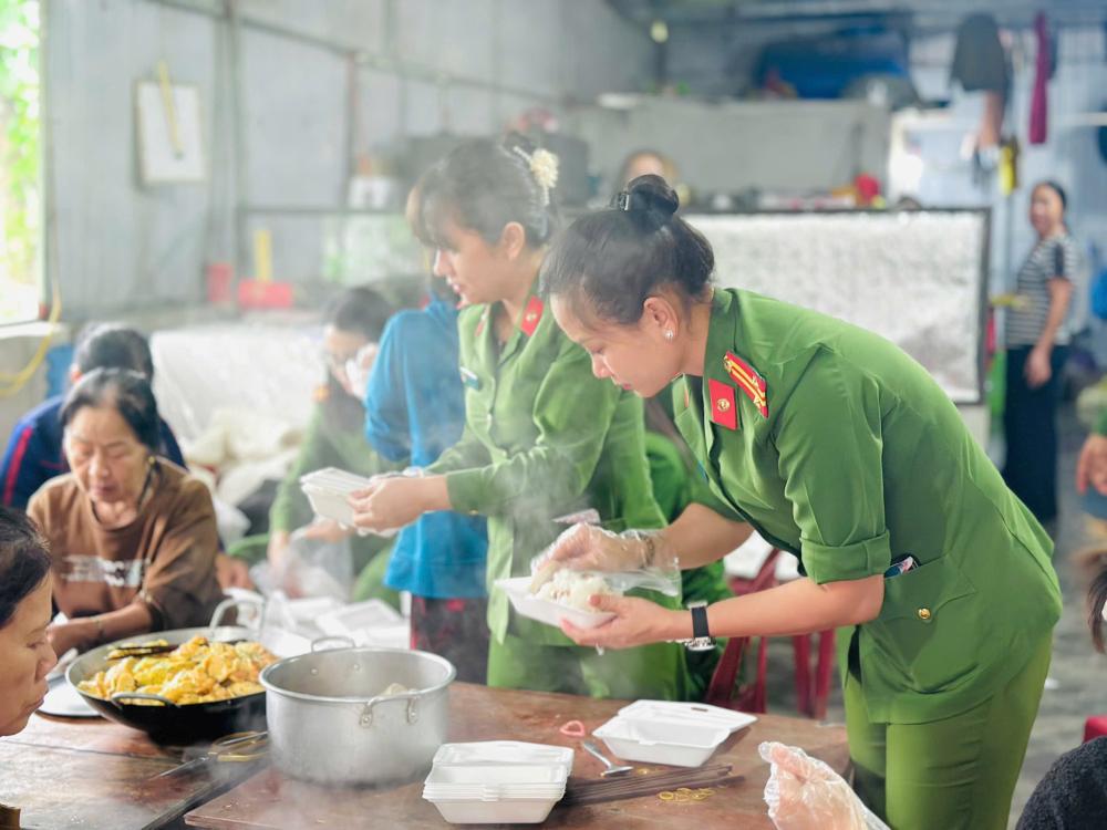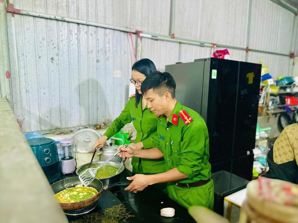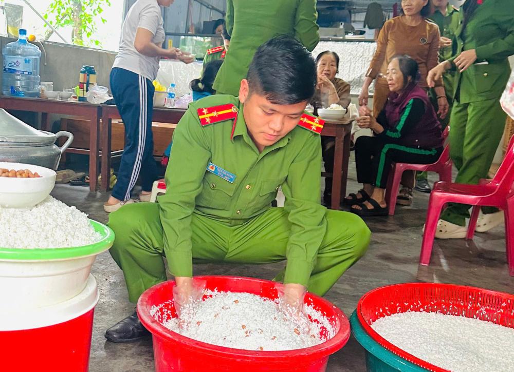 Ngay từ sáng sớm các cán bộ, hội viên, đoàn viên Công an phường đã cùng nhau chuẩn bị nguyên liệu, tự tay nấu, đóng gói từng suất xôi với tinh thần khẩn trương, trách nhiệm và sẻ chia.