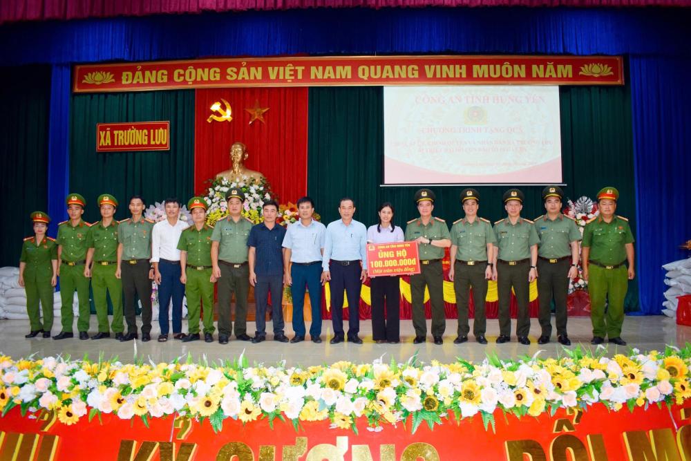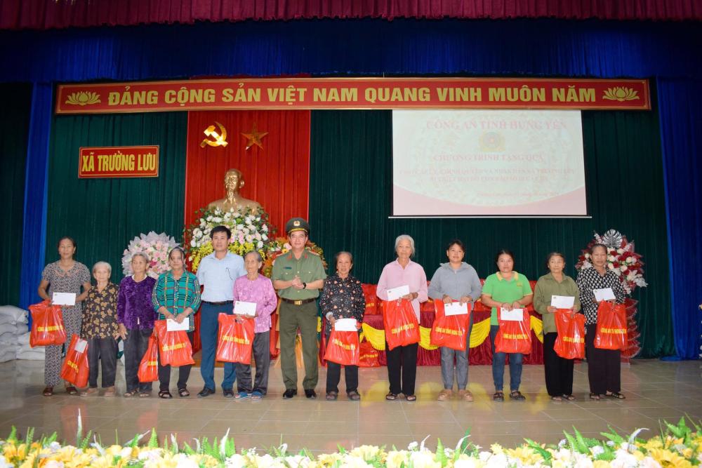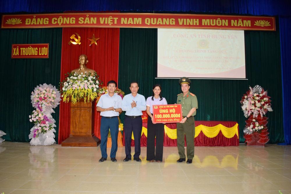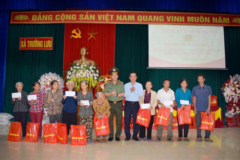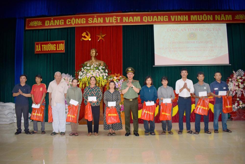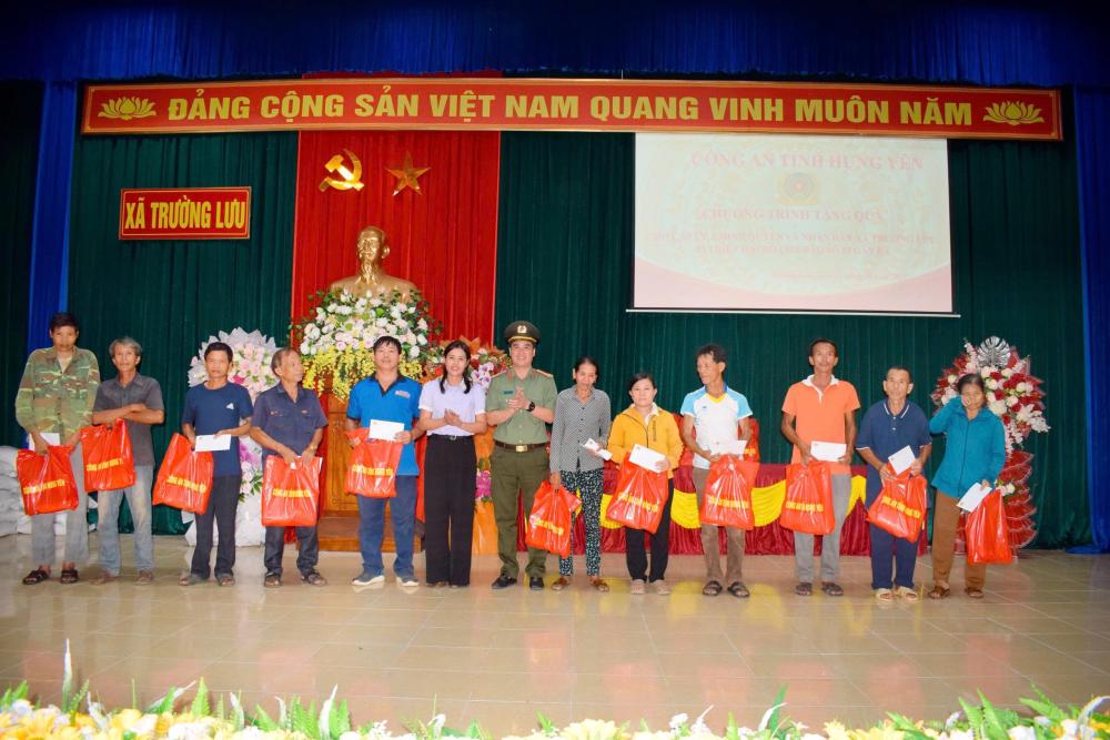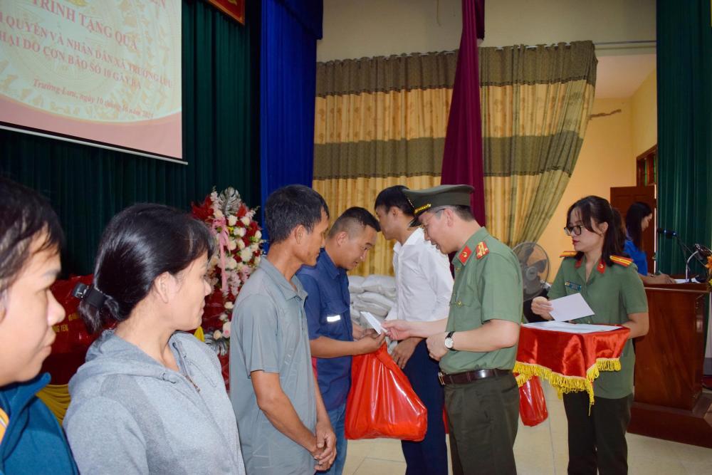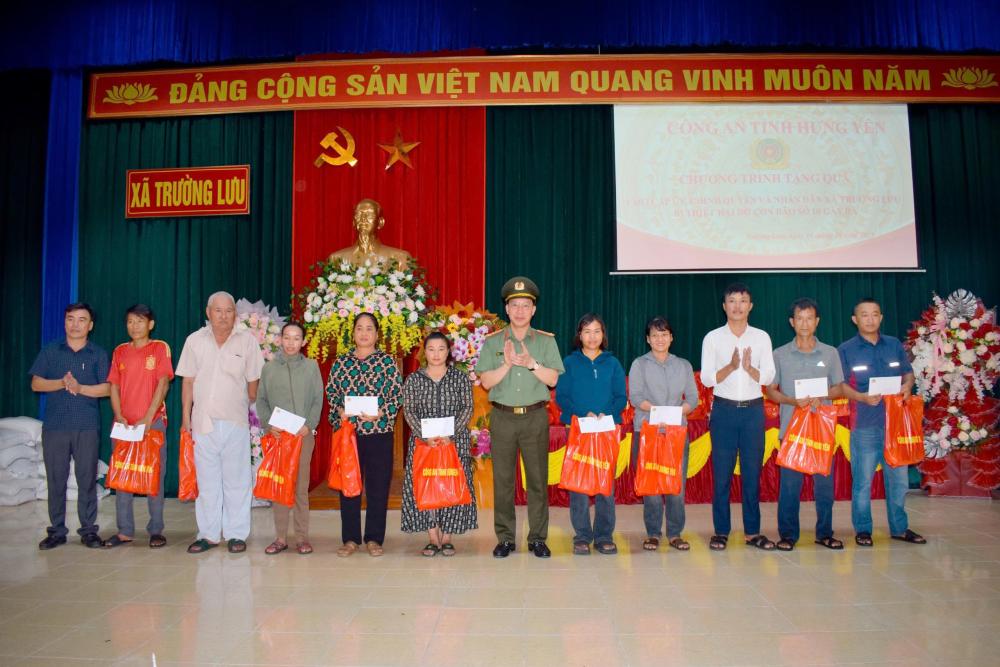 Tại buổi trao quà, đoàn công tác đã trao tặng 53 phần quà thiết thực cho các hộ gia đình có hoàn cảnh khó khăn, bị ảnh hưởng nặng do bão. Mỗi phần quà gồm các nhu yếu phẩm và tiền mặt, thể hiện tấm lòng sẻ chia, sự quan tâm sâu sắc của cán bộ, chiến sĩ Công an Hưng Yên đối với đồng bào miền Trung ruột thịt. Ngoài ra, đoàn cũng trao tặng 100 triệu đồng cho Ủy ban Mặt trận Tổ quốc xã Trường Lưu, mong muốn cấp ủy, chính quyền địa phương có thêm nguồn lực để hỗ trợ người dân sớm khắc phục thiệt hại, ổn định đời sống, tái thiết sản xuất sau thiên tai.