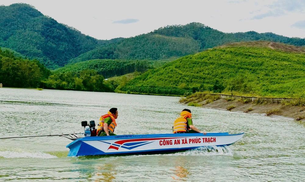 Công dân tặng xuồng máy cho Công an xã Phúc Trạch phục vụ phòng chống bão lụt và đảm bảo an ninh trật tự.