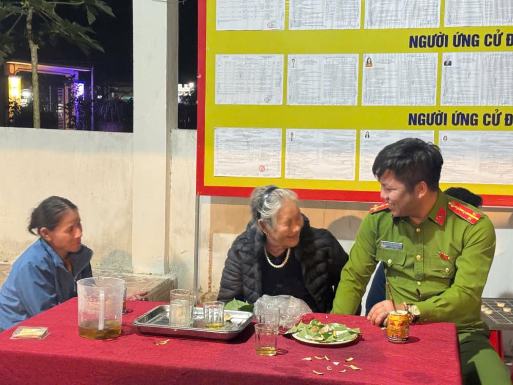 Các cán bộ công an cũng dừng lại hỏi thăm sức khỏe cụ, dặn cụ giữ gìn sức khỏe để sáng mai đi bỏ phiếu. Trong ánh đèn nơi khu vực bầu cử yên bình, nụ cười của cụ bà và nụ cười của người chiến sĩ công an như lan tỏa sự ấm áp, thể hiện sự gắn bó giữa lực lượng công an với nhân dân.