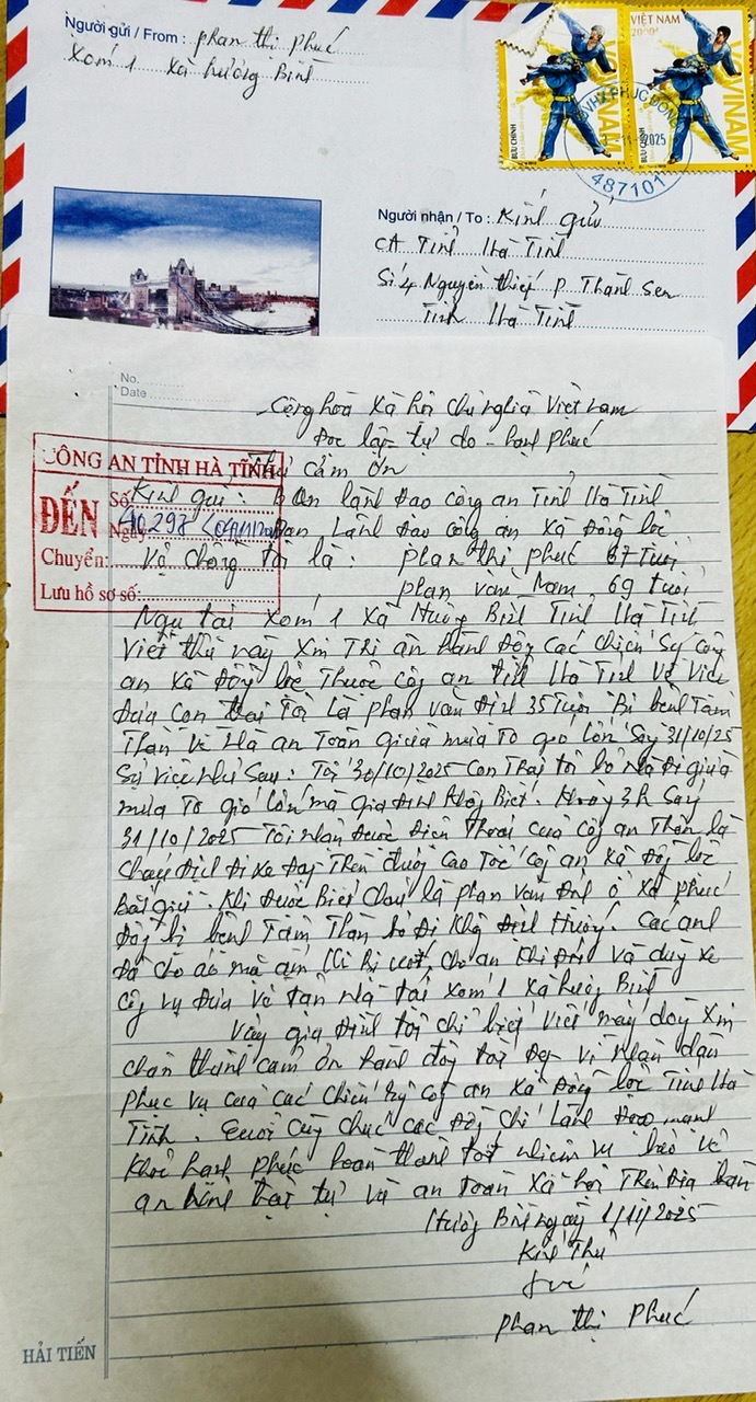 Mới đây, gia đình bà Phan Thị Phúc và ông Phan Văn Nam (ngụ tại xóm 1, xã Hương Bình) đã gửi thư cảm ơn đến Công an xã Hương Bình. Trong thư, gia đình bày tỏ lòng biết ơn sâu sắc trước tinh thần trách nhiệm, sự tận tâm của các cán bộ, chiến sĩ khi giúp đỡ tìm kiếm người thân là anh Phan Văn Định (35 tuổi) - người bị bệnh tâm thần, bỏ đi khỏi nhà không định hướng giữa thời tiết khắc nghiệt, mưa bão. Nhờ sự vào cuộc kịp thời, khẩn trương của Công an xã Hương Bình, anh Định đã được tìm thấy an toàn, trở về với gia đình trong niềm vui và xúc động của người thân, bà con lối xóm.