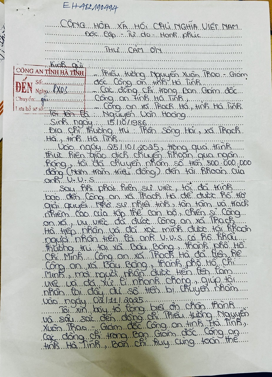 Một câu chuyện đẹp khác được chia sẻ trong lá thư của anh Nguyễn Văn Hoàng (39 tuổi), trú tại thôn Song Hải, xã Thạch Hà. Trong thư, anh Hoàng bày tỏ lòng cảm ơn sâu sắc đến Công an xã Thạch Hà đã tận tình giúp đỡ khi anh chuyển khoản nhầm 500 triệu đồng cho người lạ. Ngay khi tiếp nhận thông tin, Công an xã đã nhanh chóng xác minh, phối hợp với ngân hàng và các bên liên quan để kịp thời xác minh tài khoản nhận tiền là cá nhân sinh sống tại thành phố Hồ Chí Minh và đã kịp thời phối hợp thực hiện các biện pháp phong tỏa tài khoản, thu hồi số tiền, trả lại cho người dân. “Nhờ sự nhiệt tình, trách nhiệm của Công an xã, giúp anh Hoàng nhận lại được toàn bộ số tiền. Trong thư anh Hoàng chi sẻ: Bản thân và gia đình tôi thực sự biết ơn và cảm phục tinh thần vì dân phục vụ của các anhCông an xã”.