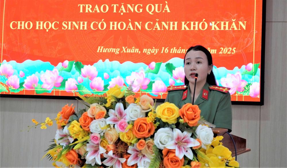 Tại chương trình, đoàn đã trực tiếp trao 10 suất quà, tổng trị giá hơn 20 triệu đồng, gồm tiền mặt, đồ dùng học tập và các nhu yếu phẩm thiết yếu cho 10 em học sinh có hoàn cảnh đặc biệt khó khăn. Đây là số tiền được Hội phụ nữ, Đoàn Thanh niên phòng Hậu Cần kêu gọi từ các mạnh thường quân, các nhà hảo tâm ủng hộ. Những món quà tuy giá trị không lớn nhưng thể hiện tấm lòng, tình cảm, trách nhiệm và sự quan tâm sẻ chia của cán bộ, chiến sĩ Phòng Hậu cần đối với các em nhỏ còn nhiều thiệt thòi trên địa bàn miền núi Hương Khê.