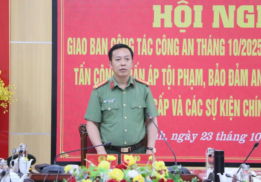 Tại hội nghị, Đại tá Nguyễn Trung Kiên, Phó Giám đốc Công an tỉnh biểu dương, ghi nhận nỗ lực, tinh thần trách nhiệm cao của toàn thể cán bộ, chiến sĩ trong thời gian qua; Kết quả đạt được trong tháng 10 và đợt cao điểm vừa qua thể hiện tinh thần đoàn kết, chủ động, sáng tạo, hiệp đồng chặt chẽ của toàn lực lượng. Tuy nhiên, tình hình tội phạm, vi phạm pháp luật vẫn còn tiềm ẩn nhiều yếu tố phức tạp; nhiệm vụ trong thời gian tới, đặc biệt là bảo đảm an ninh, trật tự, đòi hỏi toàn lực lượng phải tiếp tục nêu cao tinh thần trách nhiệm, giữ vững kỷ cương, kỷ luật, siết chặt quản lý địa bàn, đối tượng, không để bị động, bất ngờ trong mọi tình huống. Đồng chí Phó Giám đốc Công an tỉnh yêu cầu các đơn vị tiếp tục nâng cao chất lượng công tác nắm tình hình, tham mưu với cấp ủy, chính quyền địa phương trong công tác đảm bảo an ninh trật tự; chủ động phát hiện, xử lý hiệu quả các vấn đề nảy sinh; tăng cường ứng dụng khoa học, công nghệ, dữ liệu dân cư, định danh điện tử trong quản lý hành chính, phục vụ Nhân dân.
