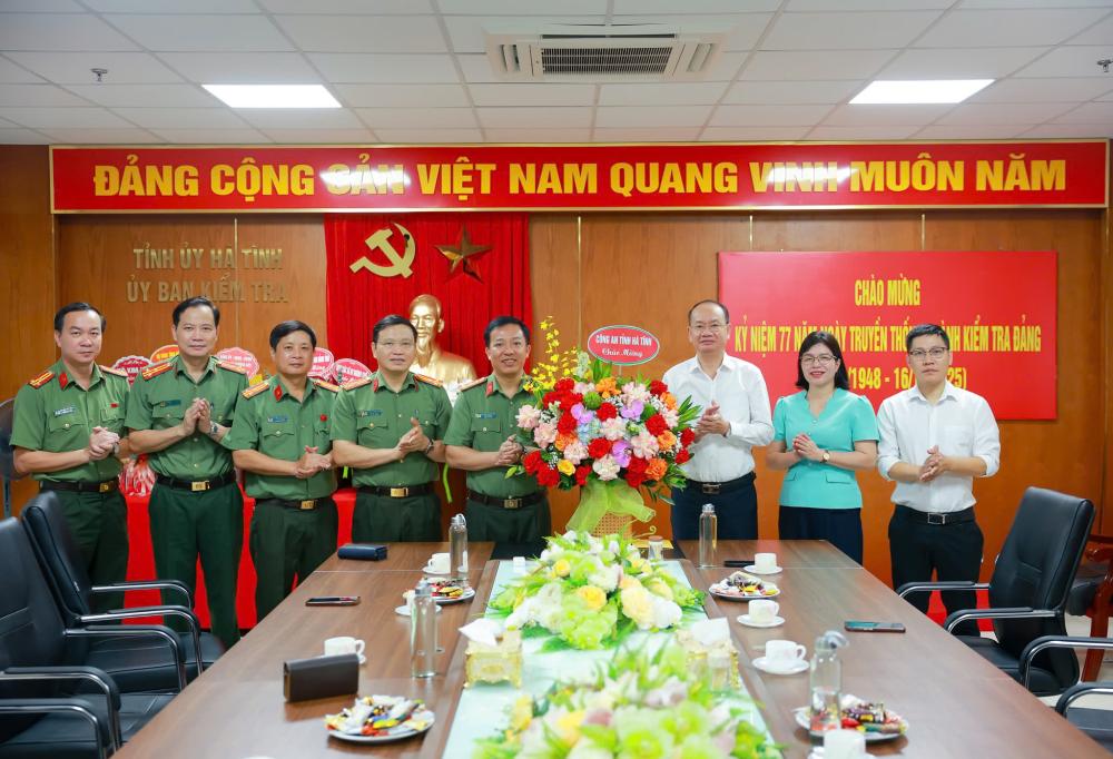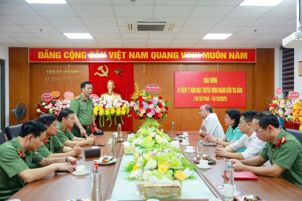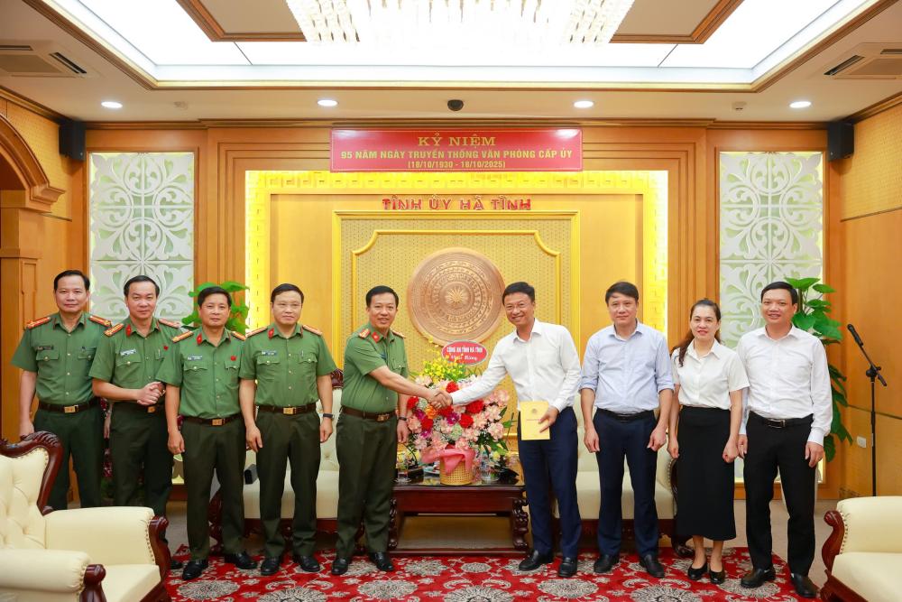 Sáng ngày 14/10, Đoàn công tác Công an tỉnh do Đại tá Nguyễn Trung Kiên – Phó Bí thư Đảng ủy, Phó Giám đốc Công an tỉnh làm Trưởng đoàn đã đến tặng hoa chúc mừng các Ban xây dựng Đảng và Văn phòng Tỉnh ủy Hà Tĩnh nhân dịp kỷ niệm 95 năm Ngày truyền thống Ngành Tổ chức xây dựng Đảng (14/10/1929 – 14/10/2025), 95 năm Ngày truyền thống Văn phòng cấp ủy (18/10/1929 – 18/10/2025) và 77 năm Ngày truyền thống ngành Kiểm tra Đảng (16/10/1948 – 16/10/2025).