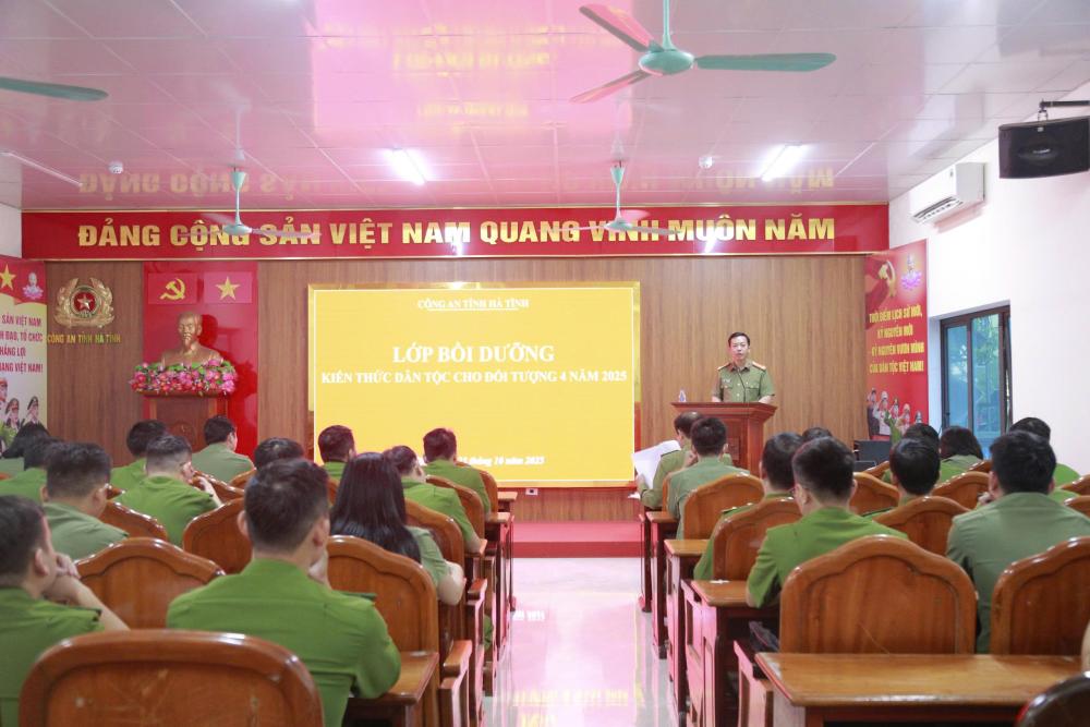 Phát biểu tại buổi lễ, đồng chí Đại tá Nguyễn Trung Kiên nhấn mạnh: việc nắm vững kiến thức về công tác dân tộc, am hiểu phong tục, tập quán, ngôn ngữ và đời sống của đồng bào các dân tộc thiểu số có ý nghĩa hết sức thiết thực trong công tác bảo đảm an ninh, trật tự; góp phần củng cố khối đại đoàn kết toàn dân tộc và chủ động phòng ngừa, đấu tranh với các thế lực thù địch lợi dụng vấn đề dân tộc, tôn giáo để chống phá Đảng, Nhà nước ta. Trong những năm qua, Đảng ủy, Ban Giám đốc Công an tỉnh Hà Tĩnh luôn quan tâm, chỉ đạo sát sao và đạt được nhiều kết quả tích cực trong công tác này. Tuy nhiên, trong bối cảnh hiện nay, khi các thế lực thù địch ngày càng đẩy mạnh chiến lược “diễn biến hòa bình”, lợi dụng vấn đề dân tộc, tôn giáo để chia rẽ khối đại đoàn kết dân tộc, thì việc bồi dưỡng kiến thức dân tộc cho cán bộ, chiến sĩ càng trở nên cấp thiết, mang ý nghĩa chiến lược lâu dài.