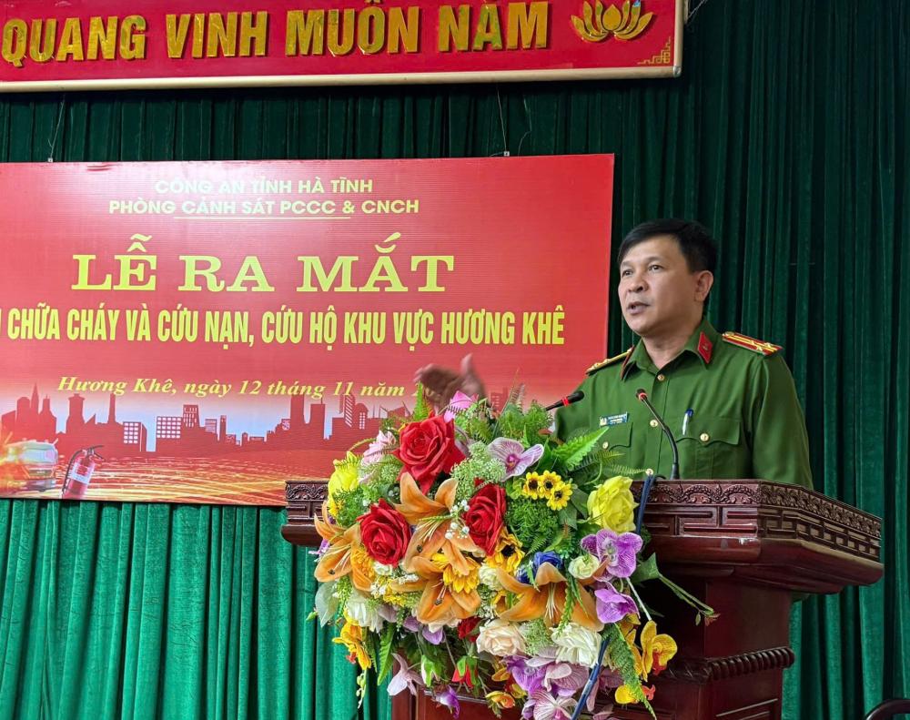 Phát biểu tại buổi lễ, Đại tá Nguyễn Duy Đông – Phó Giám đốc Công an tỉnh nhấn mạnh, việc thành lập Đội Chữa cháy và CNCH khu vực Hương Khê là bước đi cụ thể, phù hợp trong lộ trình xây dựng lực lượng PCCC và CNCH chính quy, tinh nhuệ, hiện đại. Đại tá Nguyễn Duy Đông yêu cầu lãnh đạo Phòng Cảnh sát PCCC và CNCH tập trung chỉ đạo, triển khai các mặt công tác để đội đi vào hoạt động, phát huy hiệu quả các mặt công tác PCCC và CNCH, góp phần bảo đảm an toàn, an ninh trật tự trên địa bàn. Đồng thời yêu cầu CBCS Đội chữa cháy và CNCH khu vực Hương Khê nêu cao tinh thần trách nhiệm, nhanh chóng tiếp cận nhiệm vụ, chủ động chuẩn bị trang thiết bị, phương tiện chiến đấu, đẩy mạnh công tác huấn luyện, tổ chức nghiêm túc công tác thường trực chiến đấu, kịp thời tham gia chữa cháy và CNCH hiệu quả; đồng thời làm tốt công tác điều tra cơ bản, bám nắm tình hình địa bàn, cơ sở, thực hiện có hiệu quả các mặt công tác chuyên môn nghiệp vụ, hoàn thành xuất sắc nhiệm vụ được giao.