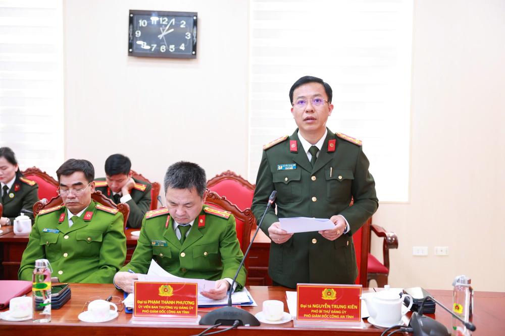 Đại tá Nguyễn Trung Kiên - Phó Bí thư Đảng ủy, Phó Giám đốc Công an tỉnh phát biểu tại hội nghị
