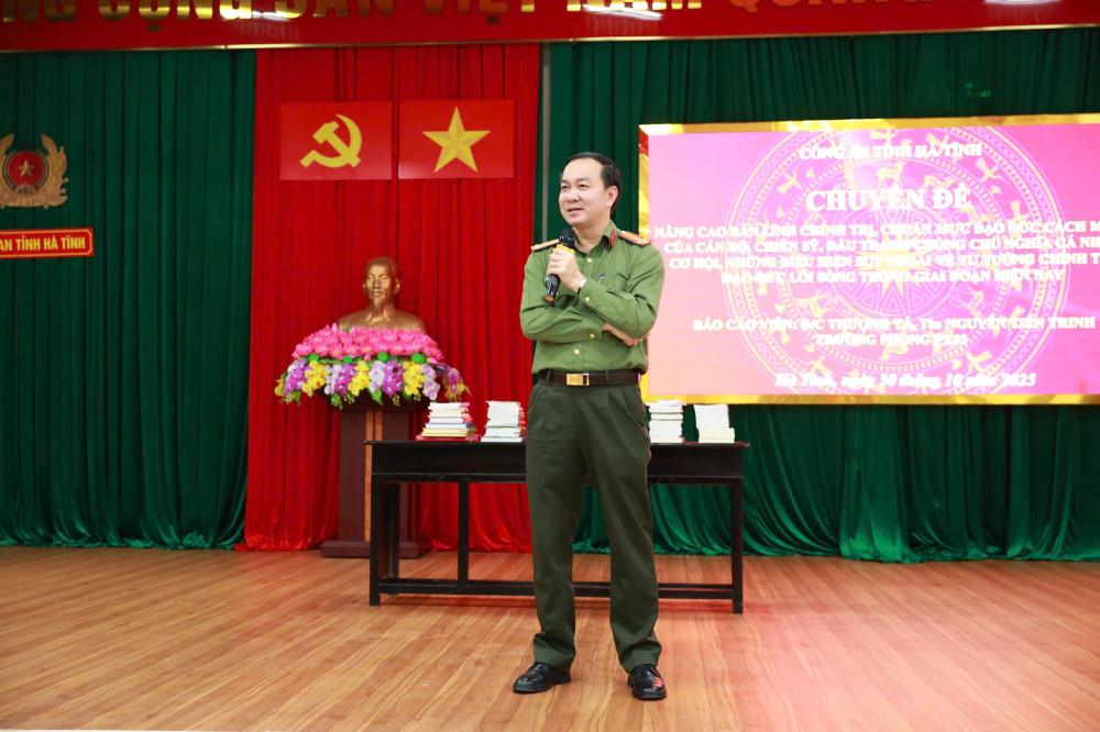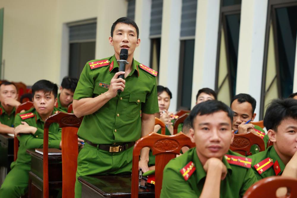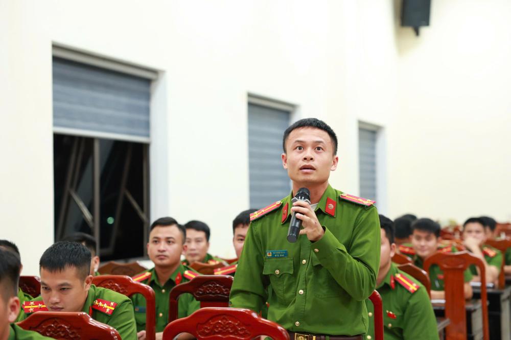 Với phong cách truyền đạt gần gũi, sinh động, Thượng tá Nguyễn Tiến Trinh đã khái quát sâu sắc vai trò của bản lĩnh chính trị – yếu tố nền tảng, quyết định phẩm chất người chiến sỹ Công an nhân dân trong thời kỳ mới. Đồng chí nhấn mạnh, trong bối cảnh hội nhập, sự bùng nổ thông tin và tác động đa chiều của mạng xã hội, mỗi cán bộ, chiến sỹ cần nêu cao tinh thần cảnh giác, kiên định với lý tưởng, tuyệt đối trung thành với Đảng, Tổ quốc và Nhân dân