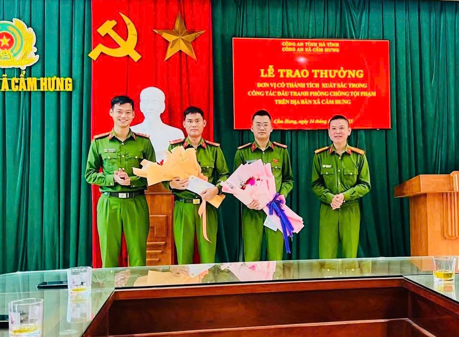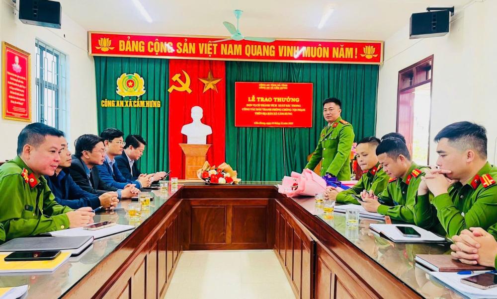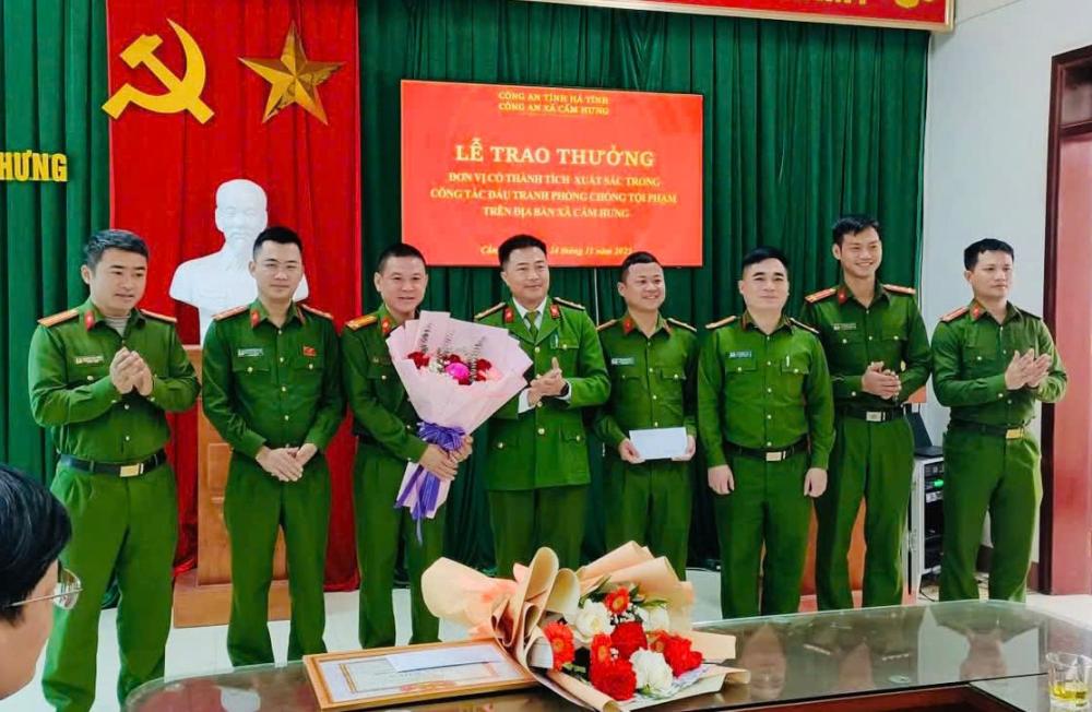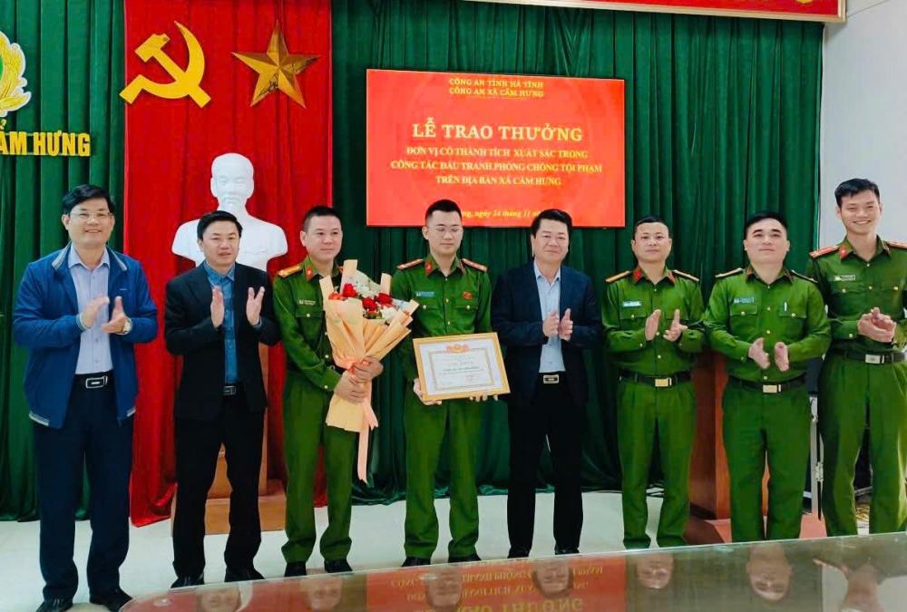Để kịp thời ghi nhận, biểu dương, động viên Công an xã về thành tích xuất sắc trong công tác đấu tranh phòng, chống tội phạm trên địa bàn, Phòng Cảnh sát kinh tế Công an tỉnh cùng với Thường trực Đảng ủy, Lãnh đạo UBND xã Cẩm Hưng đã trao thưởng và giấy khen cho các tập thể, cá nhân có thành tích xuất sắc.