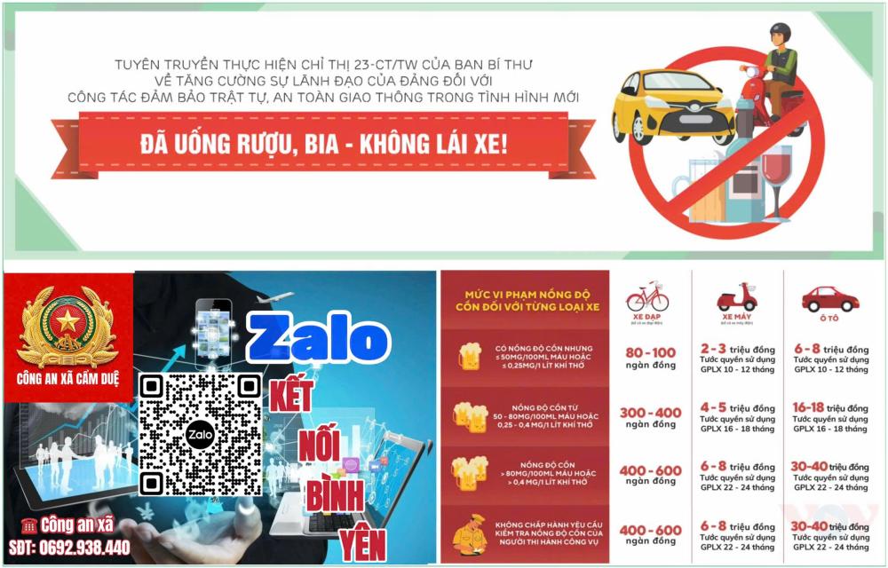 Trên cơ sở đó, Công an xã Cẩm Duệ đã chủ động triển khai nhiều biện pháp thiết thực. Lực lượng Công an tổ chức in ấn, treo dán 20 pano, áp phích tại các tuyến đường, khu vực đông dân cư, quán ăn, nhà hàng nhằm nhắc nhở trực quan, thường xuyên đến người dân. Đồng thời, phối hợp với các cơ sở kinh doanh dịch vụ ăn uống tổ chức ký cam kết không để khách hàng điều khiển phương tiện sau khi sử dụng rượu, bia; tích cực vận động, nhắc nhở khách lựa chọn phương án di chuyển an toàn.