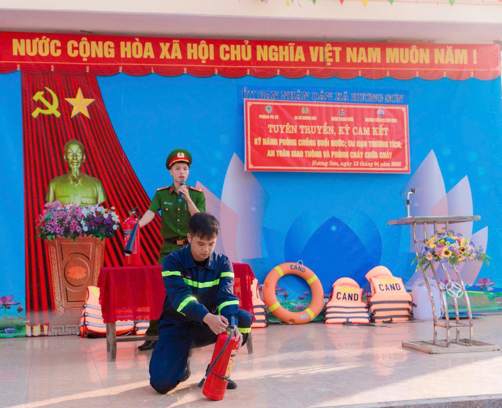 Cùng ngày, tại Trường Tiểu học Sơn Ninh, Công an xã Hương Sơn phối hợp với Đoàn xã và Phòng Cảnh sát PCCC và CNCH Công an tỉnh tổ chức chương trình tuyên truyền, ký cam kết về phòng, chống đuối nước, tai nạn thương tích, an toàn giao thông và PCCC cho 18 cán bộ, giáo viên cùng 250 học sinh. Chương trình được triển khai với hình thức sinh động, kết hợp lý thuyết và thực hành, giúp học sinh trực tiếp trải nghiệm sử dụng các phương tiện như áo phao, phao cứu sinh, bình chữa cháy, qua đó nâng cao khả năng ứng phó với các tình huống nguy hiểm. Dịp này, nhà trường cũng tổ chức cho học sinh ký cam kết thực hiện nghiêm các quy định về đảm bảo an toàn trong dịp hè.