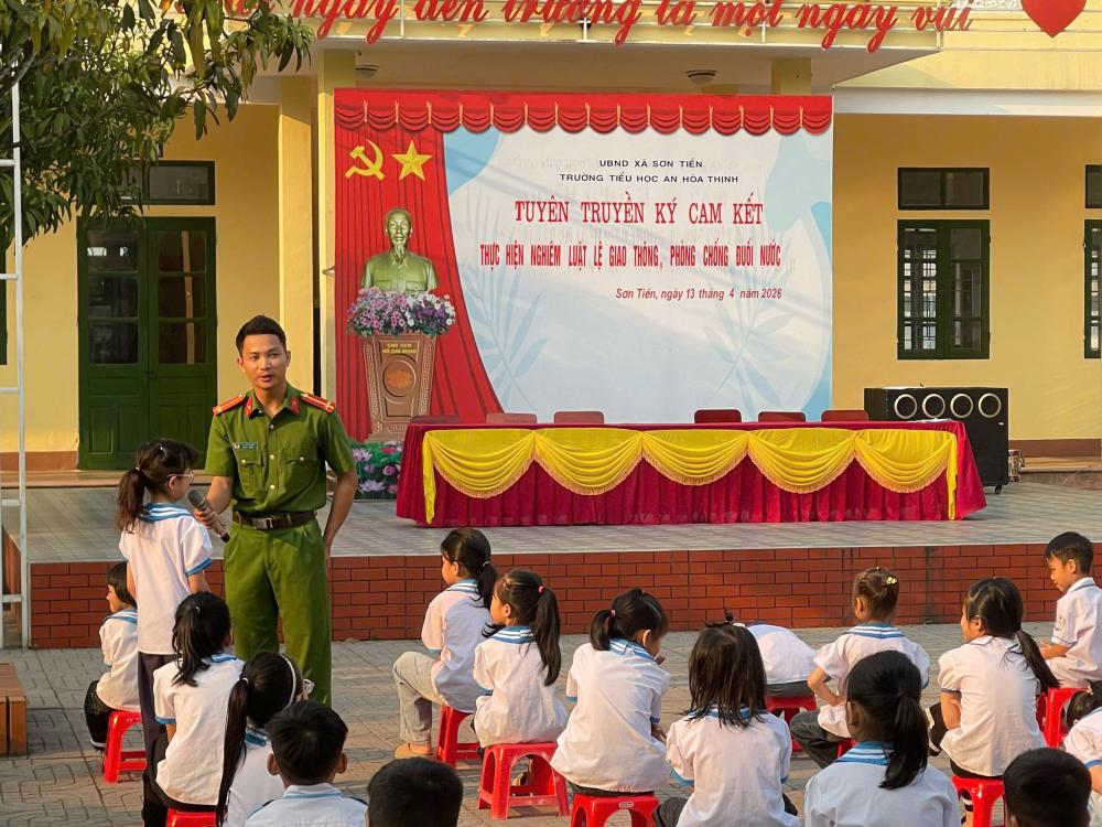 Tại xã Sơn Tiến, Công an xã phối hợp với Trường Tiểu học An Hòa Thịnh tổ chức tuyên truyền cho 28 cán bộ, giáo viên và 435 học sinh. Xuất phát từ thực tế địa bàn có nhiều ao, hồ, khe, đập tiềm ẩn nguy cơ mất an toàn, lực lượng Công an đã tập trung trang bị kỹ năng phòng, chống đuối nước; hướng dẫn các em không tự ý bơi lội khi không có người lớn; đồng thời phổ biến kiến thức về an toàn giao thông, PCCC và cảnh báo nguy cơ cháy rừng trong mùa nắng nóng.
