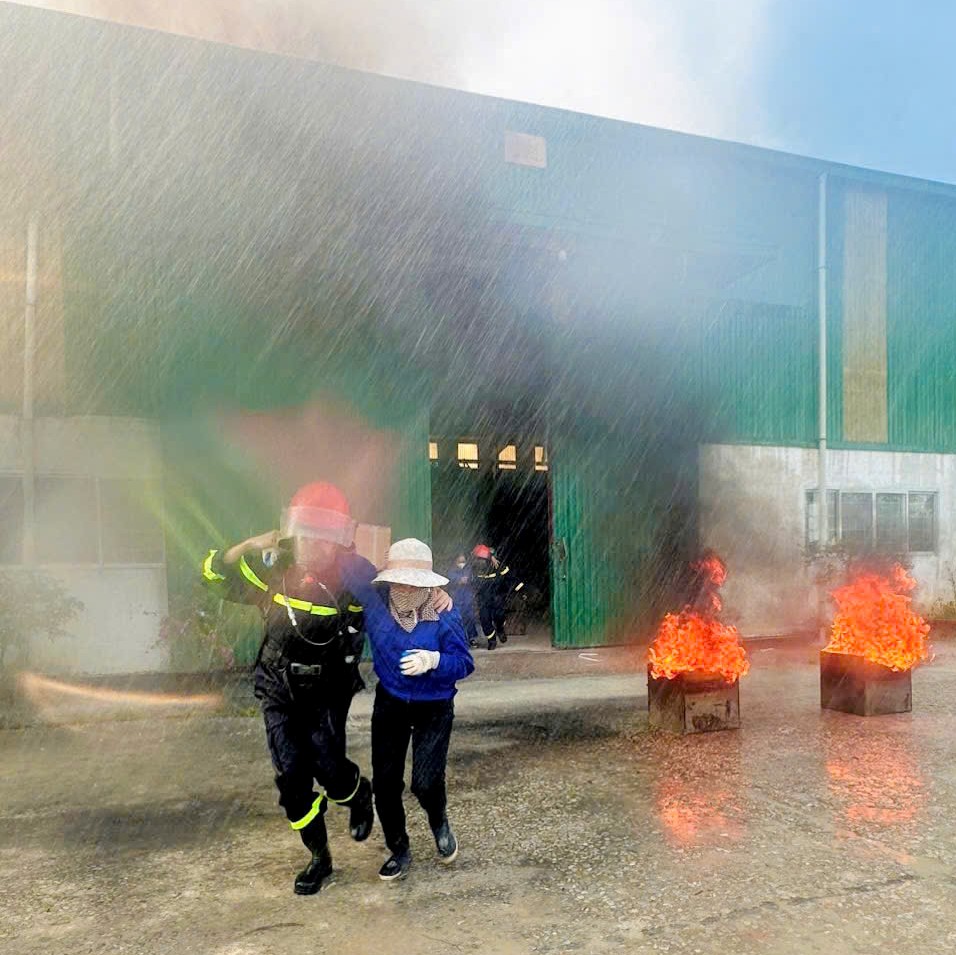 Sau đó, tiến hành thực tập phương án chữa cháy, cứu nạn cứu hộ xảy ra cháy tại khu vực nhà xưởng nghiền quặng, nguyên nhân do sự cố thiết bị điện, dự kiến có khoảng 05 người bị mắc kẹt bên trong; đội phòng cháy chữa cháy và cứu nạn cơ sở đã tiến hành các bước quy trình xử lý sự cố ban đầu như: báo động, cắt nguồn điện, sử dụng phương tiện chữa cháy ban đầu, cứu người bị nạn, di dời tài sản … nhận thấy tình hình đám cháy diễn biến phức tạp, đã gọi báo cho lực lượng Cảnh sát PCCC và CNCH qua số điện thoại 114.