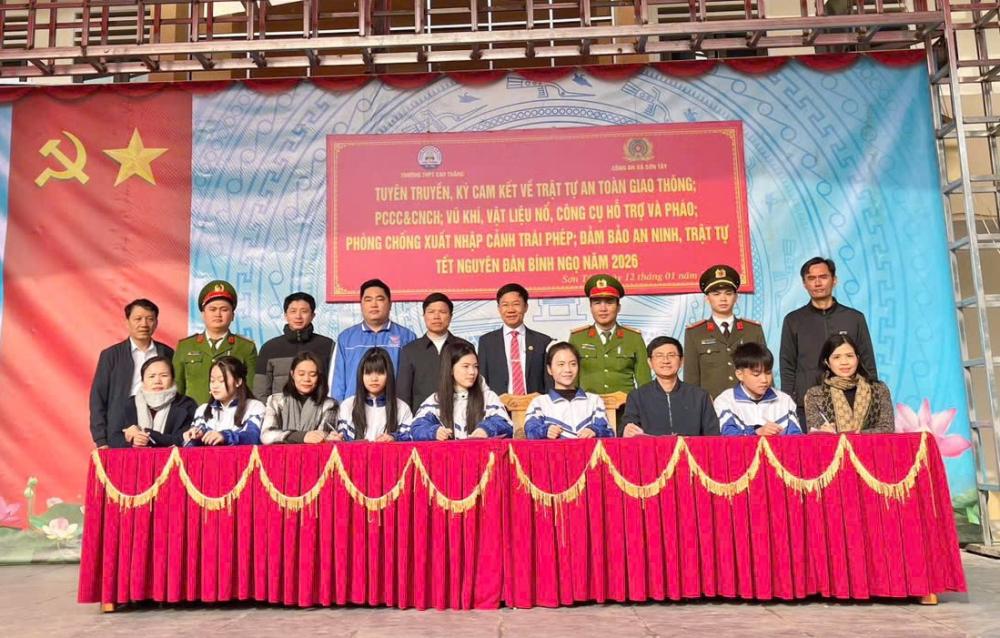 Bên cạnh đó, lực lượng Công an cũng tuyên truyền về công tác phòng, chống xuất nhập cảnh trái phép, nâng cao ý thức cảnh giác trước các hành vi vi phạm pháp luật, góp phần giữ vững an ninh trật tự trên địa bàn trong thời điểm trước, trong và sau Tết Nguyên đán 2026. Kết thúc buổi tuyên truyền, đại diện Ban Giám hiệu nhà trường, cán bộ, giáo viên và học sinh Trường THPT Cao Thắng đã ký cam kết chấp hành nghiêm các quy định của pháp luật, cùng chung tay xây dựng môi trường học đường an toàn, lành mạnh và góp phần đảm bảo an ninh trật tự, an toàn xã hội trên địa bàn xã Sơn Tây.