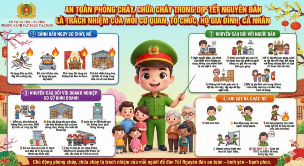 Thời điểm cuối năm, nhu cầu sinh hoạt, sản xuất, kinh doanh tăng cao, kéo theo việc sử dụng điện, gas, thiết bị sinh nhiệt và tích trữ hàng hóa phục vụ Tết. Đây cũng là giai đoạn tiềm ẩn nhiều nguy cơ cháy, nổ. Phòng Cảnh sát PCCC và CNCH Công an tỉnh Hà Tĩnh khuyến cáo người dân chủ động triển khai các biện pháp phòng ngừa, bảo đảm an toàn phòng cháy, chữa cháy trước, trong và sau Tết Nguyên đán Bính Ngọ 2026.