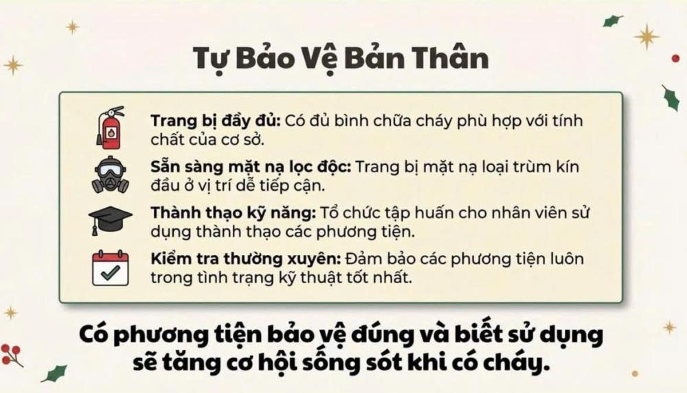 Mỗi gia đình nên trang bị bình chữa cháy xách tay, đèn pin, thang dây, dây cứu người và các dụng cụ phá dỡ đơn giản, đồng thời nắm vững kỹ năng thoát nạn, xử lý tình huống khi xảy ra sự cố. Đối với chợ, trung tâm thương mại và cơ sở kinh doanh, cần xây dựng phương án phòng cháy, chữa cháy cụ thể, tổ chức tự kiểm tra định kỳ, phân công lực lượng trực trong suốt dịp trước, trong và sau Tết, bảo đảm các hệ thống báo cháy, chữa cháy hoạt động ổn định, hiệu quả.